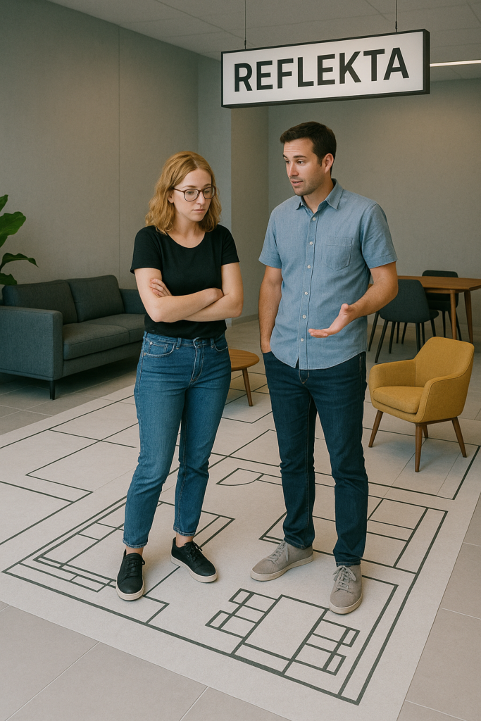 ברגע שהתוכנית הוקרנה בגודל 1:1 על רצפת האולם, קרן שתקה. דני הסתובב פעמיים סביב עצמו וניסה להבין איפה בדיוק אמור להיכנס השולחן הענק שהם כבר קנו באינטרנט. (רמז: הוא לא.)